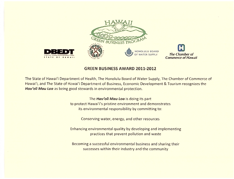 The Hawaiʻi Green Business Awards Program is a partnership between the Hawaiʻi State Department of Health, DB EDT, the Honolulu Board of Water Supply, the City and County of Honolulu's Environmental Services Recycling Office, and the Chamber of Commerce of Hawaiʻi. The program encourages businesses and organizations to implement efficiency measures and share information and support each other in operating in an environmentally sustainable manner.