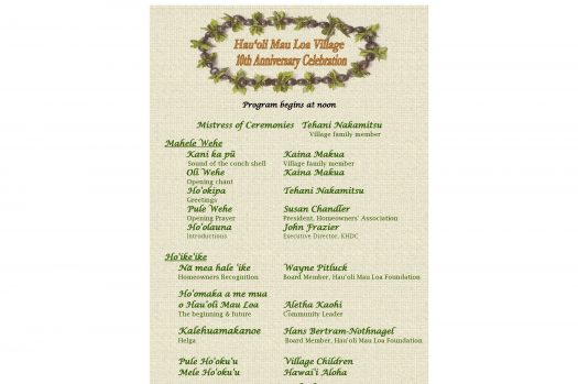 On August 22, 2010, the Foundation wanted to acknowledge the success of Hauʻoli Mau Loa Village in Waimea, Kauaʻi and celebrate its 10th Anniversary. This was made possible through the contributions of the families who created homes for themselves and their neighbors.